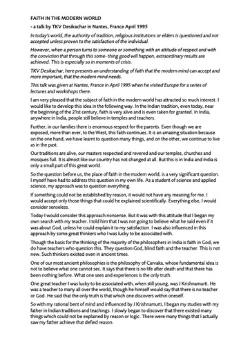 TKV Desikachar, here presents an understanding of faith that the modern mind can accept and more important, that the modern mind needs.